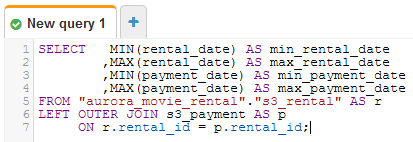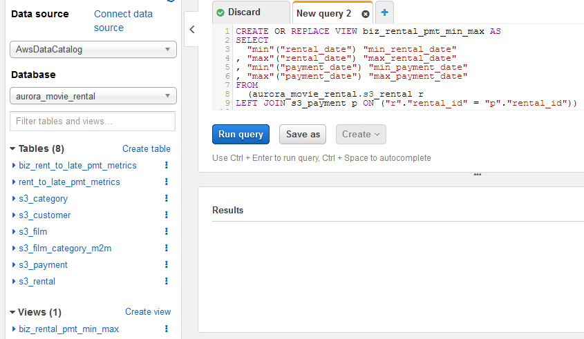 When a query accomplishes something that has potential for re-usability, creating a view from it is a standard way of storing it for re-use while masking the queries code from new queries written using it. The screenshot below is a simple example of this, using the dataset we already created in Glue.
