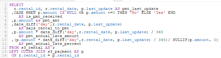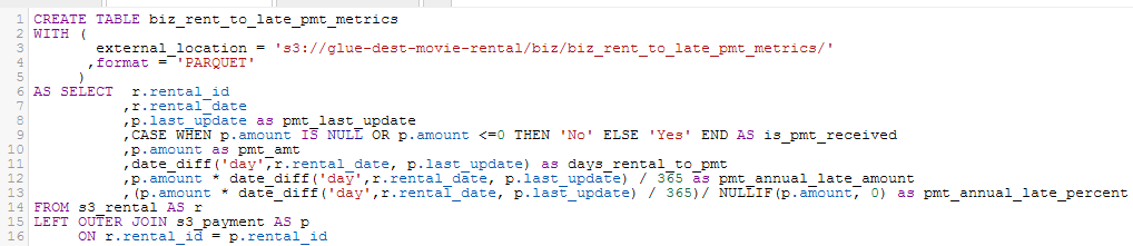 Do we want Athena users to create tables? Depending on the Athena user, the answer in the context of self-service analytics — or disciplined Athena usage — is yes. Suppose a data engineer uses Glue to instantiate data in the Data Catalog while automating the ETL into S3 based on the known, documented business requirement. Now, as the business requirement evolves, it becomes apparent that a certain additional one-time, or at least infrequent, data transformation is necessary, and when combining the size of the dataset with the complexity of the needed transformation, simply creating a new view is insufficient. First off, the view may take too long to return data. Secondly, if this is a one-time or infrequent transformation (thus needing little or no new data going forward), then our Amazon bill will remain smaller if we avoid re-running the same logic over and over simply to get the same answer from the data, which is what a view, or a query, does. So yes, creating tables in Athena can make sense, and next we will discuss what is involved. Simply for demo purposes, the query in the screenshot below represents an important query that creates more overhead on each run than we want to keep paying to Amazon. Although we should also assume that the people creating the Athena tables understand the ramifications of creating tables, remember that Athena workgroups can be governed with data processing limits.