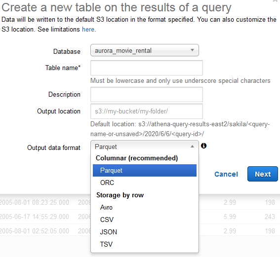 - An S3 folder must be specified wherein the table’s data records will be stored. In the screenshot below, notice the S3 folder path. We have created a special ‘biz’ S3 folder to organize all self-service objects created by this Athena workgroup and, of course, have trained out table-creating users to specify it in their created tables.
