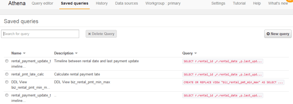 In the above screenshot of the query editor page, note the ‘Save as’ button. Providing simple, meaningful, and ideally standardized, query names and descriptions goes a long way towards productive collaboration among team members within an Athena workgroup.