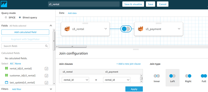 I will now join to another table by clicking ‘Add data’. After choosing a second table, notice in the screenshot below that I have manually entered the join fields and selected Left join, because I want to see rentals even if no payment was made.