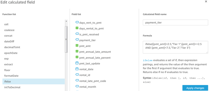 Building them here during data preparation, instead of later during the creation of analyses, has the big advantage of making them available as common calculations for all analyses using the same data set. Function categories include aggregates, date functions, conditional functions, math, numeric functions, string functions, and for use with Quicksight pivot table visuals at the time I’m writing this, table calculations. Notably, calculated field functions are case-sensitive, so we will stick with the case shown in the Function list