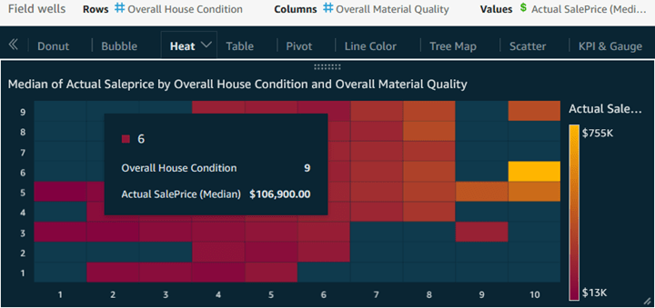 Heat maps, leveraging only position and color, are essentially histograms for a more right-brained analysis. As is the case with histograms and bubble charts, heat maps leverage the fact that we tend to unconsciously consider ‘upper’ to be better than ‘lower’, so in this heat map, we place measures with higher numbers indicating better. In this case, I decided, for the x axis to make ‘right’ mean better than ‘left’, but this choice is only a subjective preference. From there, we use colors, which either instinctively, or at least with a good legend, also indicate better vs. worse, as we see here. Heat maps are largely about exploratory analysis, or for coaxing an information consumer in with an intriguing display needing some random mousing over, and the pop-up cell rewards it with an the exact median price for that combination of house condition and material quality ratings.