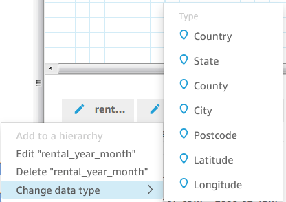 Quicksight has some built in geospatial mapping capabilities. For Quicksight geospatial documentation in AWS, see Adding Geospatial Data. The screenshot below shows the out-of-the-box geospatial data types that may be assigned to a field in our dataset.