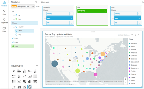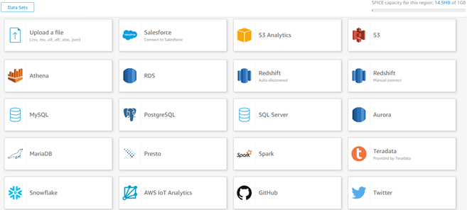 In the upper-left corner, ‘Upload a file’ means load data into SPICE, Quicksight’s data extract engine. More on SPICE below. For the remainder, any Quicksight data manipulation causes a direct query on that data source. Lots of choices to be sure. Besides Athena, it’s also great to see Presto, RDS, EMR, Redshift, some leading on-premises RDBMS, plus Snowflake, and Salesforce. Details on supported data sources, including some not highlighted above, are here.