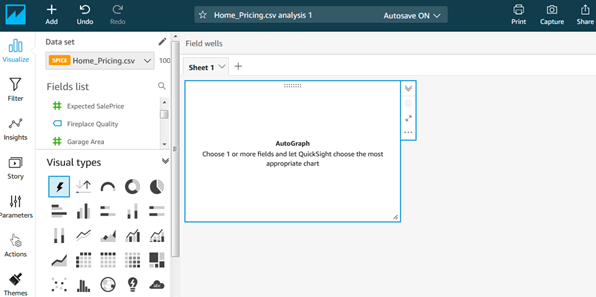 - In the upper bar, the Analysis name. An Analysis will evolve during development, and whenever we arrive at any task-completion milestone, we should will want to assign a versioned name, like Home Sales v0.2, so we can revert to it later if we end up breaking something with new coding. Autosave, the default, is a good choice here, but does not version the name.