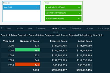 Table Visual: Any data visualization tool should be able to create tabular output, and here is a Table visual, with conditional formatting added for low and high annual sales counts. Notice how all three values were renamed to make sense here.