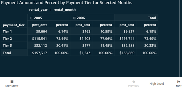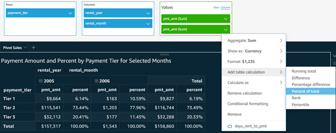 Pivot Table Visual: The screenshot below shows a pivot table from a different data set on rental sales by year and month number on columns, and payment tier on rows, with both row and column totals and with subtotals selected only for columns. We also have a percent of total table calculation, calculated ‘Table down’ as the screenshot added immediately below it shows.