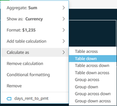 Quicksight offers basic pivot table functionality, and table calculations add some sophistication. As of this writing, however, pivot tables are the only place Quicksight table calculations are employed.
