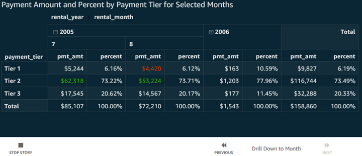The screenshot below is a Story based on the Pivot Table previously viewed, both with that initial scene and a second scene as a simple drill-down showing months with some conditional formatting for high or low payment amounts.