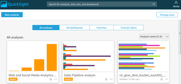 - A choice of default view and sorting: All analyses, All dashboards, Favorites, or Tutorial videos